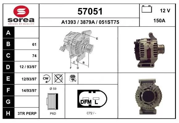 Alternateur EAI 57051 Critères Article complémentaire/Info complémentaire : avec régulateur intégré Connexion/pince : sans raccord pour compte-tours Courant de charge de l'alternateur (A) : 150 A Nombre de gorges : 6 Numéro d'information technique : C72