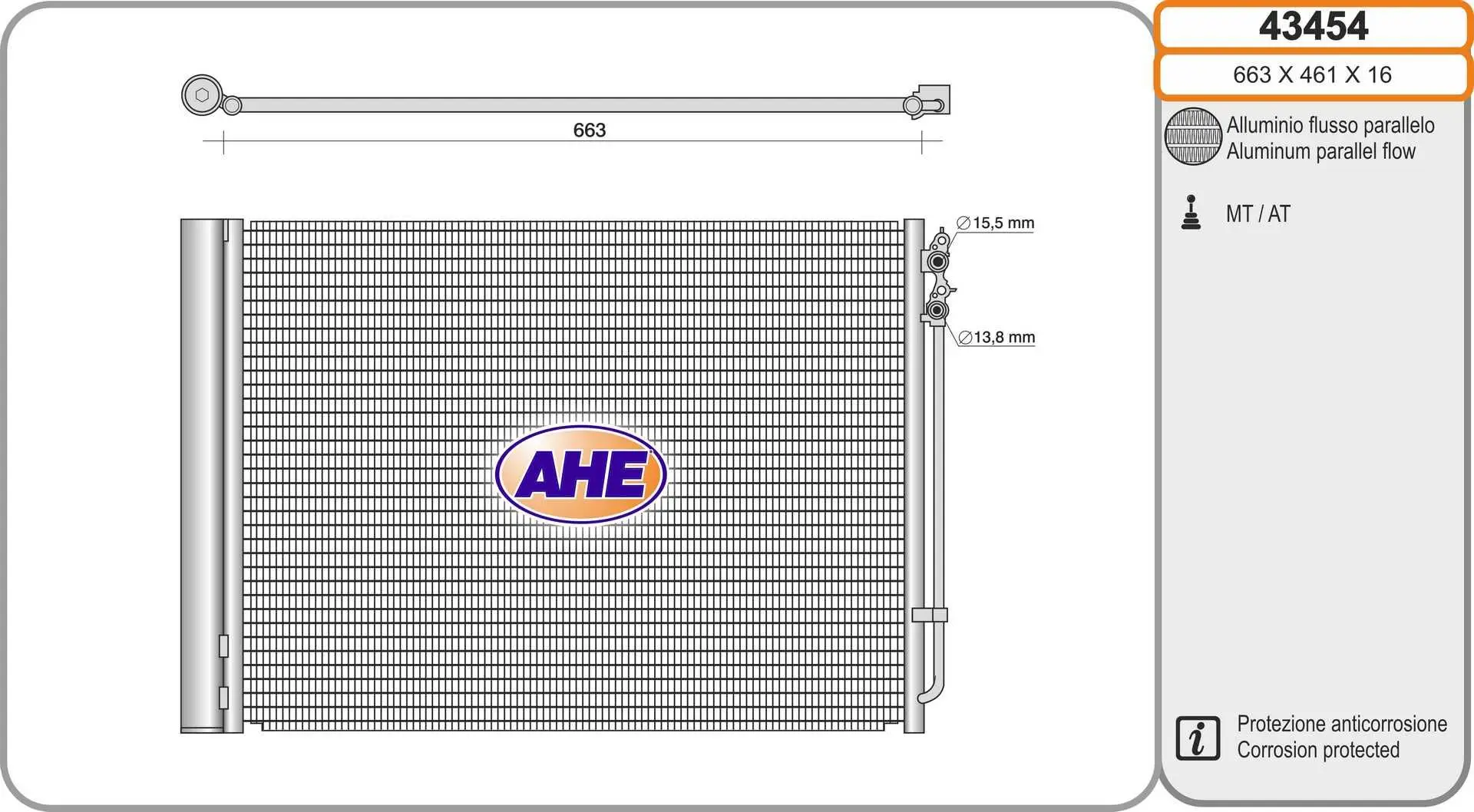Radiateur climatisation AHE 43454 Critères Largeur de filet [mm] : 461 mm Longueur de filet [mm] : 663 mm Profondeur de filet [mm] : 16 mm