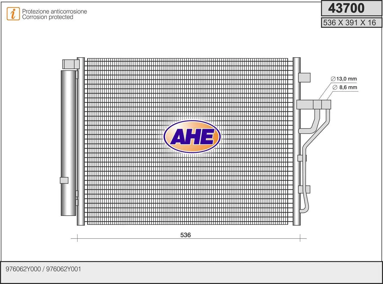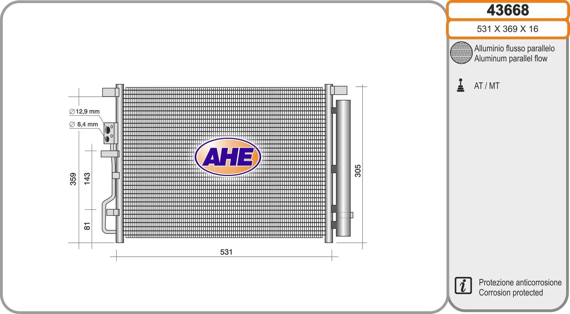 Radiateur climatisation AHE 43668 Critères Largeur de filet [mm] : 369 mm Longueur de filet [mm] : 531 mm Profondeur de filet [mm] : 16 mm