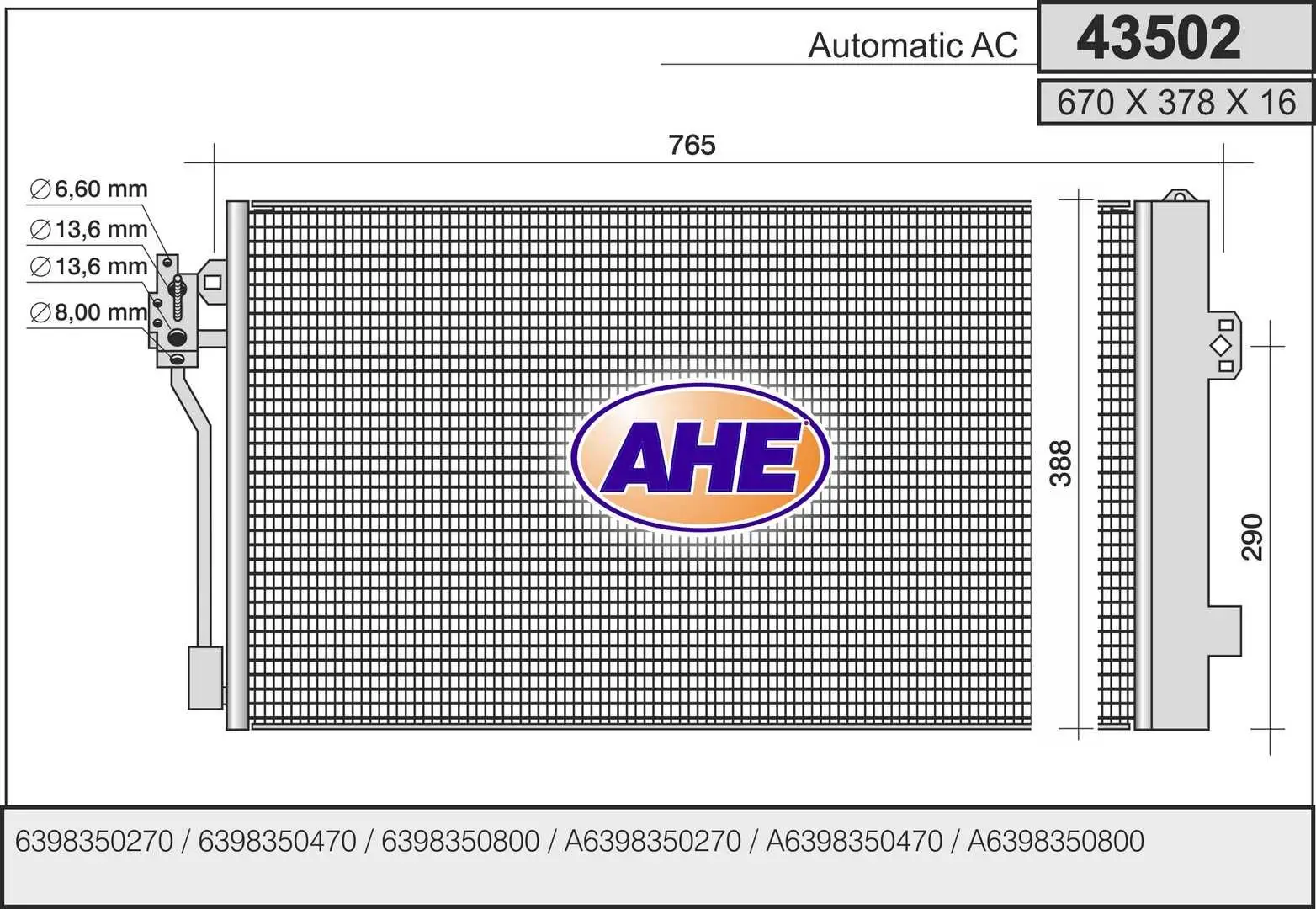 Radiateur climatisation AHE 43502 Critères Largeur de filet [mm] : 387 mm Longueur de filet [mm] : 682 mm Profondeur de filet [mm] : 16 mm