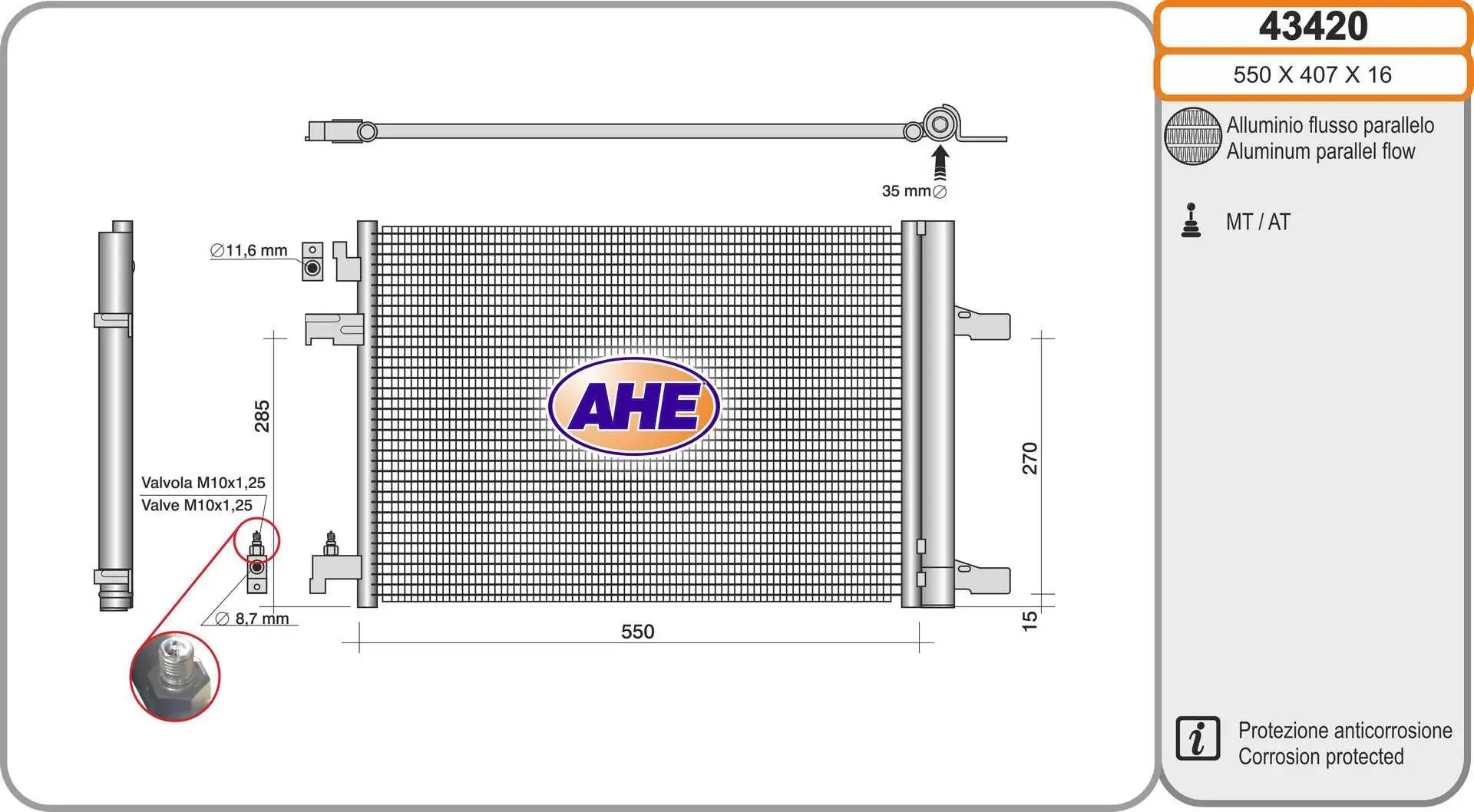 Radiateur climatisation AHE 43420 Critères Largeur de filet [mm] : 407 mm Longueur de filet [mm] : 550 mm Profondeur de filet [mm] : 16 mm