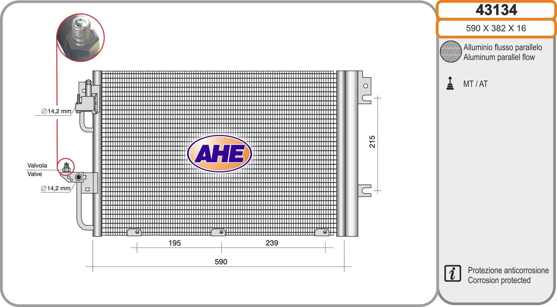Radiateur climatisation AHE 43134 Critères Largeur de filet [mm] : 382 mm Longueur de filet [mm] : 590 mm Profondeur de filet [mm] : 16 mm