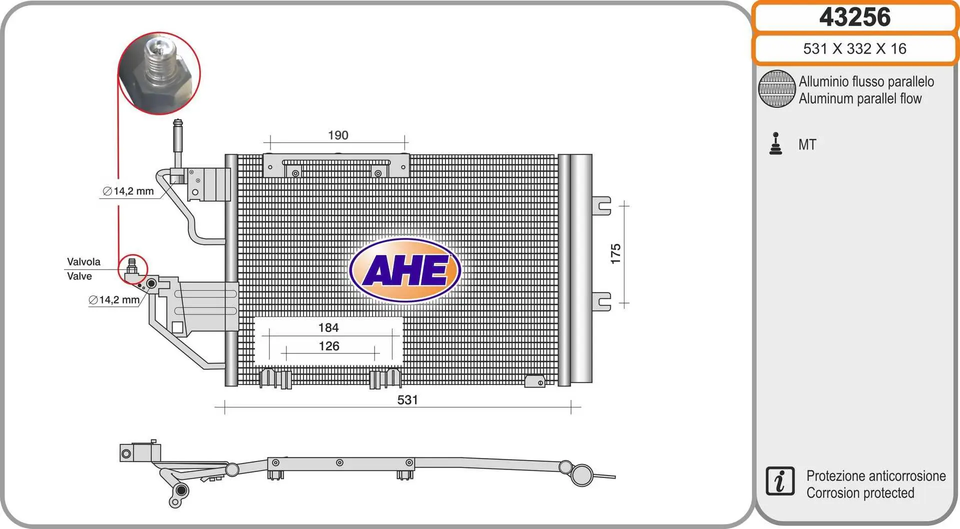 Radiateur climatisation AHE 43256 Critères Largeur de filet [mm] : 332 mm Longueur de filet [mm] : 531 mm Profondeur de filet [mm] : 16 mm