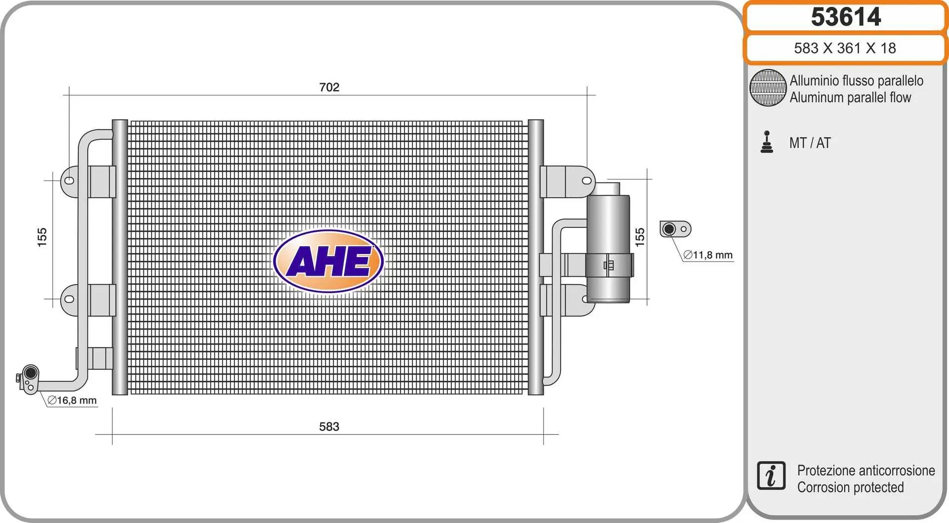 Radiateur climatisation AHE 53614 Critères Largeur de filet [mm] : 361 mm Longueur de filet [mm] : 583 mm Profondeur de filet [mm] : 18 mm