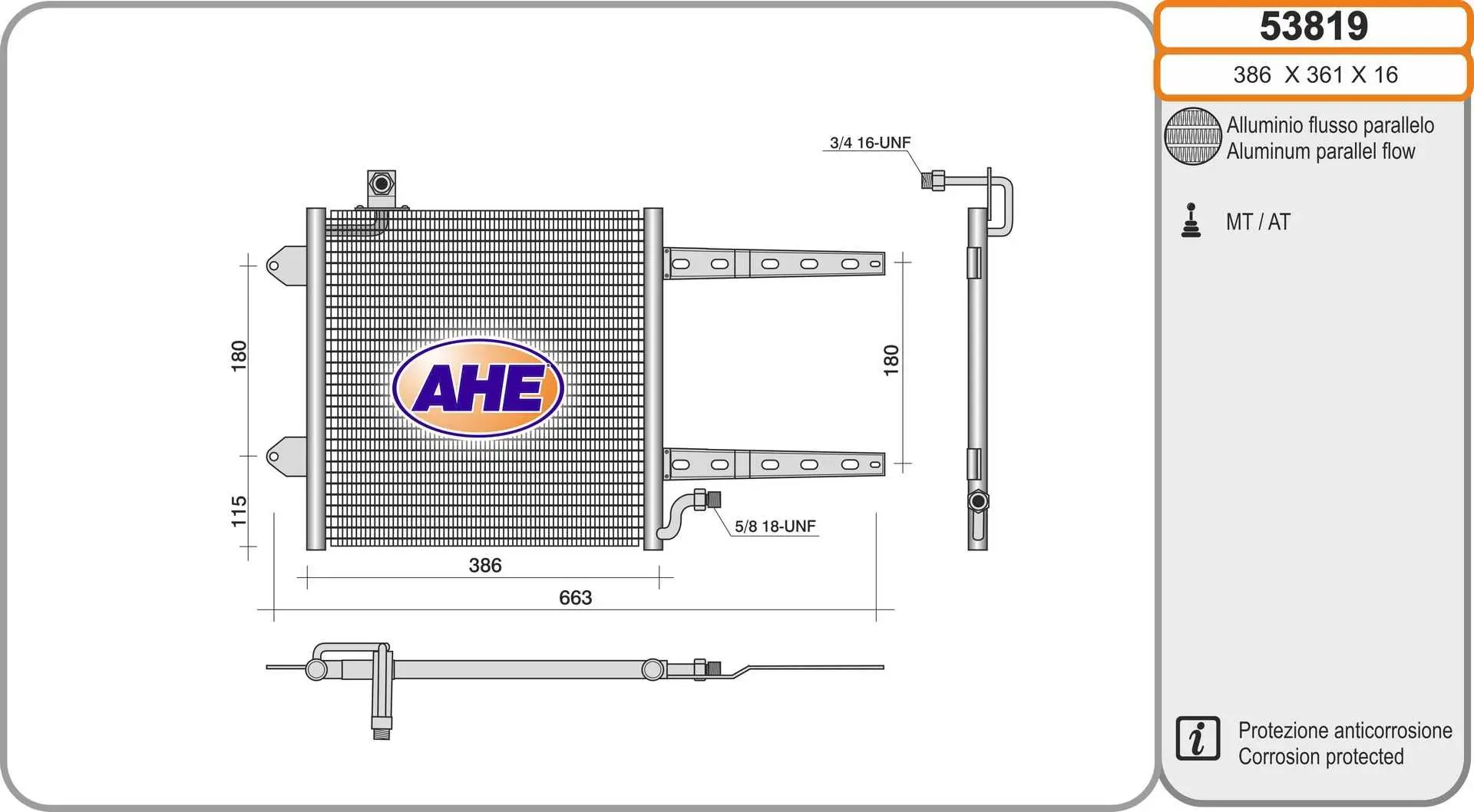 Radiateur climatisation AHE 53819 Critères Largeur de filet [mm] : 361 mm Longueur de filet [mm] : 386 mm Profondeur de filet [mm] : 16 mm