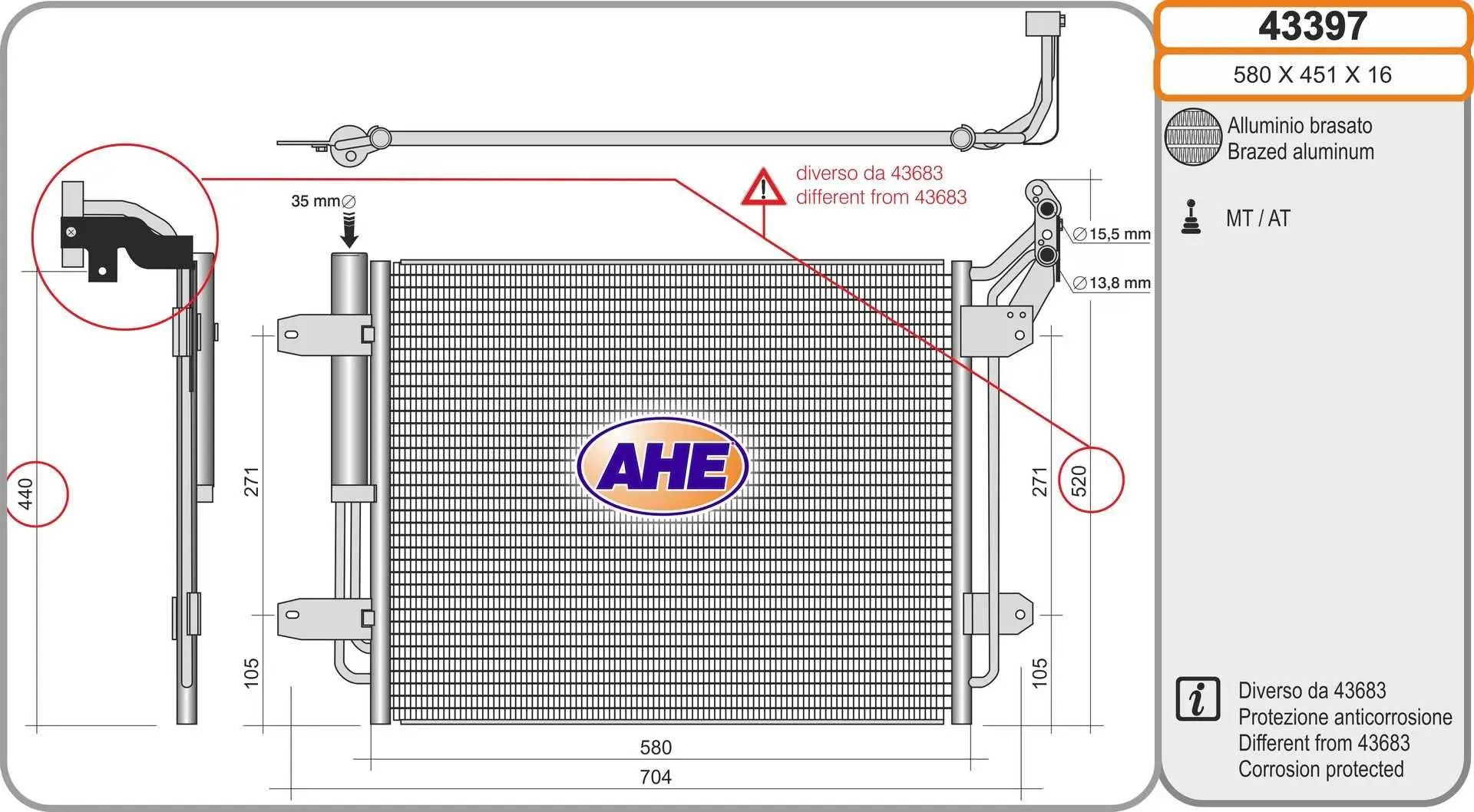 Radiateur climatisation AHE 43397 Critères Largeur de filet [mm] : 451 mm Longueur de filet [mm] : 580 mm Profondeur de filet [mm] : 16 mm