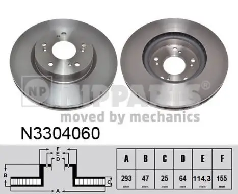 Jeu de 2 Disques de frein NIPPARTS N3304060 Pour véhicule avec pour réf. OE 45251TV2E00 Critères Cercle de percage -Ø [mm] : 114,3 mm Diamètre du centrage [mm] : 64 mm Diamètre extérieur [mm] : 293 mm Diamètre moyeu de roue [mm] : 155 mm Endroit d'assemblage : Essieu avant