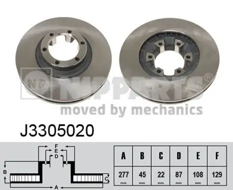 Jeu de 2 Disques de frein NIPPARTS J3305020 Critères Cercle de percage -Ø [mm] : 108 mm Diamètre du centrage [mm] : 87 mm Diamètre extérieur [mm] : 277 mm Diamètre moyeu de roue [mm] : 129 mm Endroit d'assemblage : Essieu avant