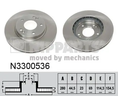 Jeu de 2 Disques de frein NIPPARTS N3300536 Critères Cercle de percage -Ø [mm] : 114,3 mm Diamètre du centrage [mm] : 69 mm Diamètre extérieur [mm] : 280 mm Diamètre moyeu de roue [mm] : 154,5 mm Endroit d'assemblage : Essieu avant