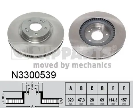 Jeu de 2 Disques de frein NIPPARTS N3300539 Pour véhicule avec pour jante en alliage léger Critères Cercle de percage -Ø [mm] : 114,3 mm Diamètre du centrage [mm] : 69 mm Diamètre extérieur [mm] : 320 mm Diamètre moyeu de roue [mm] : 157 mm Endroit d'assemblage : Essieu avant