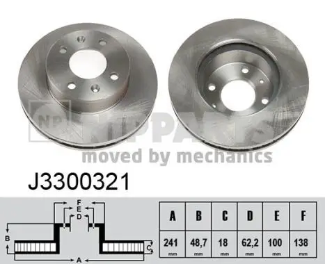 Jeu de 2 Disques de frein NIPPARTS J3300321 Critères Cercle de percage -Ø [mm] : 100 mm Diamètre du centrage [mm] : 62,2 mm Diamètre extérieur [mm] : 241 mm Diamètre moyeu de roue [mm] : 138 mm Endroit d'assemblage : Essieu avant
