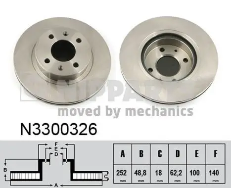 Jeu de 2 Disques de frein NIPPARTS N3300326 Pour véhicule avec Dimension des freins 14"" Critères Cercle de percage -Ø [mm] : 100 mm Diamètre du centrage [mm] : 62,2 mm Diamètre extérieur [mm] : 252 mm Diamètre moyeu de roue [mm] : 140 mm Endroit d'assemblage : Essieu avant
