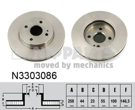 Jeu de 2 Disques de frein NIPPARTS N3303086 Critères Cercle de percage -Ø [mm] : 100 mm Diamètre du centrage [mm] : 55 mm Diamètre extérieur [mm] : 258 mm Diamètre moyeu de roue [mm] : 146,3 mm Endroit d'assemblage : Essieu avant