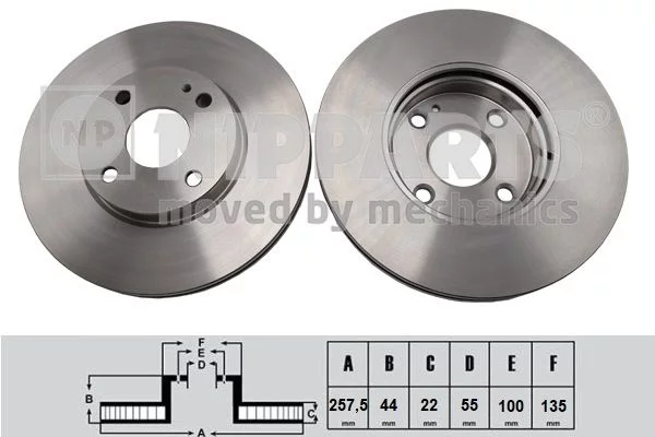 Jeu de 2 Disques de frein NIPPARTS N3303103 Critères Cercle de percage -Ø [mm] : 100 mm Diamètre du centrage [mm] : 55 mm Diamètre du moyeu [mm] : 135 mm Diamètre extérieur [mm] : 257,5 mm Endroit d'assemblage : Essieu avant