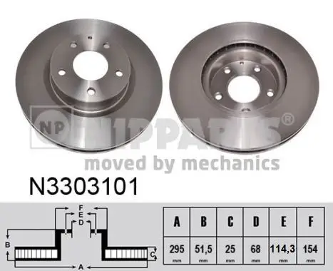 Jeu de 2 Disques de frein NIPPARTS N3303101 Critères Cercle de percage -Ø [mm] : 114,3 mm Diamètre du centrage [mm] : 68 mm Diamètre extérieur [mm] : 295 mm Diamètre moyeu de roue [mm] : 154 mm Endroit d'assemblage : Essieu avant