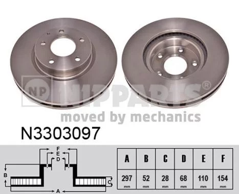 Jeu de 2 Disques de frein NIPPARTS N3303097 Critères Cercle de percage -Ø [mm] : 114,3 mm Diamètre du centrage [mm] : 68 mm Diamètre du moyeu [mm] : 154 mm Diamètre extérieur [mm] : 297 mm Endroit d'assemblage : Essieu avant