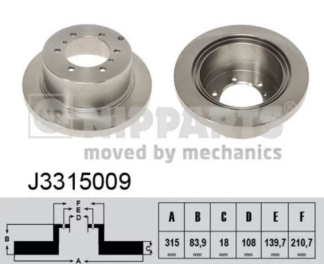 Jeu de 2 Disques de frein NIPPARTS J3315009 Critères Cercle de percage -Ø [mm] : 139,7 mm Diamètre du centrage [mm] : 108 mm Diamètre du moyeu [mm] : 210,7 mm Diamètre extérieur [mm] : 315 mm Endroit d'assemblage : Essieu arrière