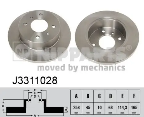 Jeu de 2 Disques de frein NIPPARTS J3311028 Critères Cercle de percage -Ø [mm] : 114,3 mm Diamètre du centrage [mm] : 68 mm Diamètre extérieur [mm] : 258 mm Diamètre moyeu de roue [mm] : 165 mm Endroit d'assemblage : Essieu arrière