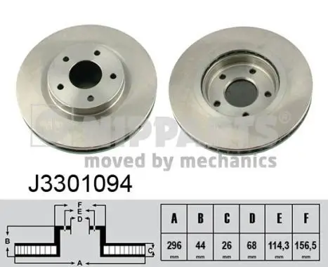 Jeu de 2 Disques de frein NIPPARTS J3301094 Pour véhicule avec Côté d'assemblage Essieu avant Critères Cercle de percage -Ø [mm] : 114,3 mm Diamètre du centrage [mm] : 68 mm Diamètre extérieur [mm] : 296 mm Diamètre moyeu de roue [mm] : 156,5 mm Épaisseur du disque de frein [mm] : 26 mm