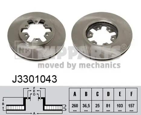 Jeu de 2 Disques de frein NIPPARTS J3301043 Critères Cercle de percage -Ø [mm] : 103 mm Diamètre du centrage [mm] : 81 mm Diamètre extérieur [mm] : 260 mm Diamètre moyeu de roue [mm] : 157 mm Endroit d'assemblage : Essieu avant