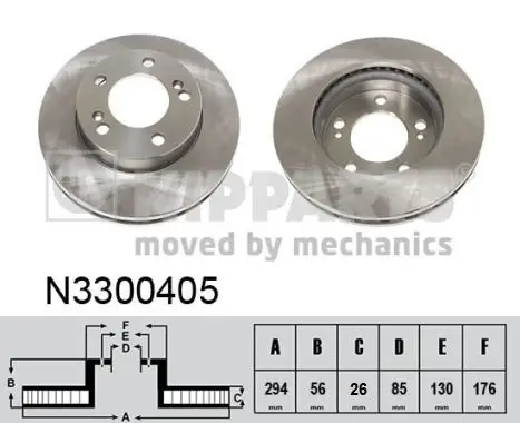 Jeu de 2 Disques de frein NIPPARTS N3300405 Pour véhicule avec Côté d'assemblage Essieu avant Critères Cercle de percage -Ø [mm] : 130 mm Diamètre du centrage [mm] : 85 mm Diamètre extérieur [mm] : 294 mm Diamètre moyeu de roue [mm] : 176 mm Épaisseur du disque de frein [mm] : 26 mm