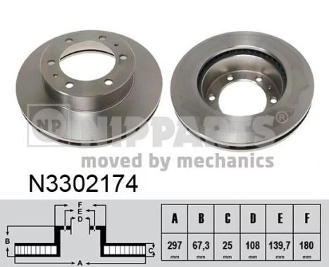 Jeu de 2 Disques de frein NIPPARTS N3302174 Pour véhicule avec pour empattement rallongé Critères Cercle de percage -Ø [mm] : 139,7 mm Diamètre du centrage [mm] : 108 mm Diamètre du moyeu [mm] : 183 mm Diamètre extérieur [mm] : 297 mm Endroit d'assemblage : Essieu avant