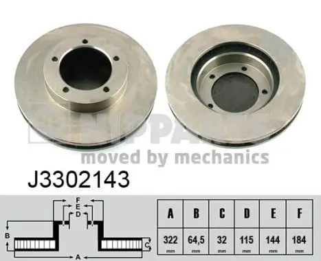 Jeu de 2 Disques de frein NIPPARTS J3302143 Critères Cercle de percage -Ø [mm] : 144 mm Diamètre du centrage [mm] : 115 mm Diamètre extérieur [mm] : 322 mm Diamètre moyeu de roue [mm] : 184 mm Endroit d'assemblage : Essieu avant