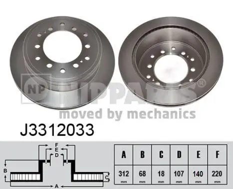 Jeu de 2 Disques de frein NIPPARTS J3312033 Critères Cercle de percage -Ø [mm] : 140 mm Diamètre du centrage [mm] : 107 mm Diamètre extérieur [mm] : 312 mm Diamètre moyeu de roue [mm] : 220 mm Endroit d'assemblage : Essieu arrière