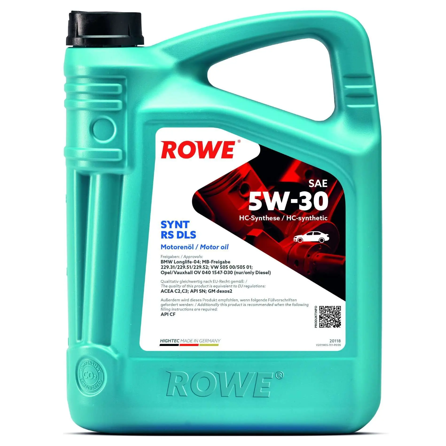 Huile moteur ROWE 5W30 SYNT RS 5L Pour véhicule avec Code moteur M57TU Contenance 8,25 I Critères Autorisation du fabricant : BMW Longlife-04, MB 229.31/229.51, MB 229.52, 229.31/229.51/229.52, OV 040 1547-D30 Capacité [litres] : 5 I Huile : Huile de synthèse HC (Hydro-Cracked) Recommandation du fabricant d'huile : GM dexos2 Spécification : ACEA C2,C3, API SN, API CF