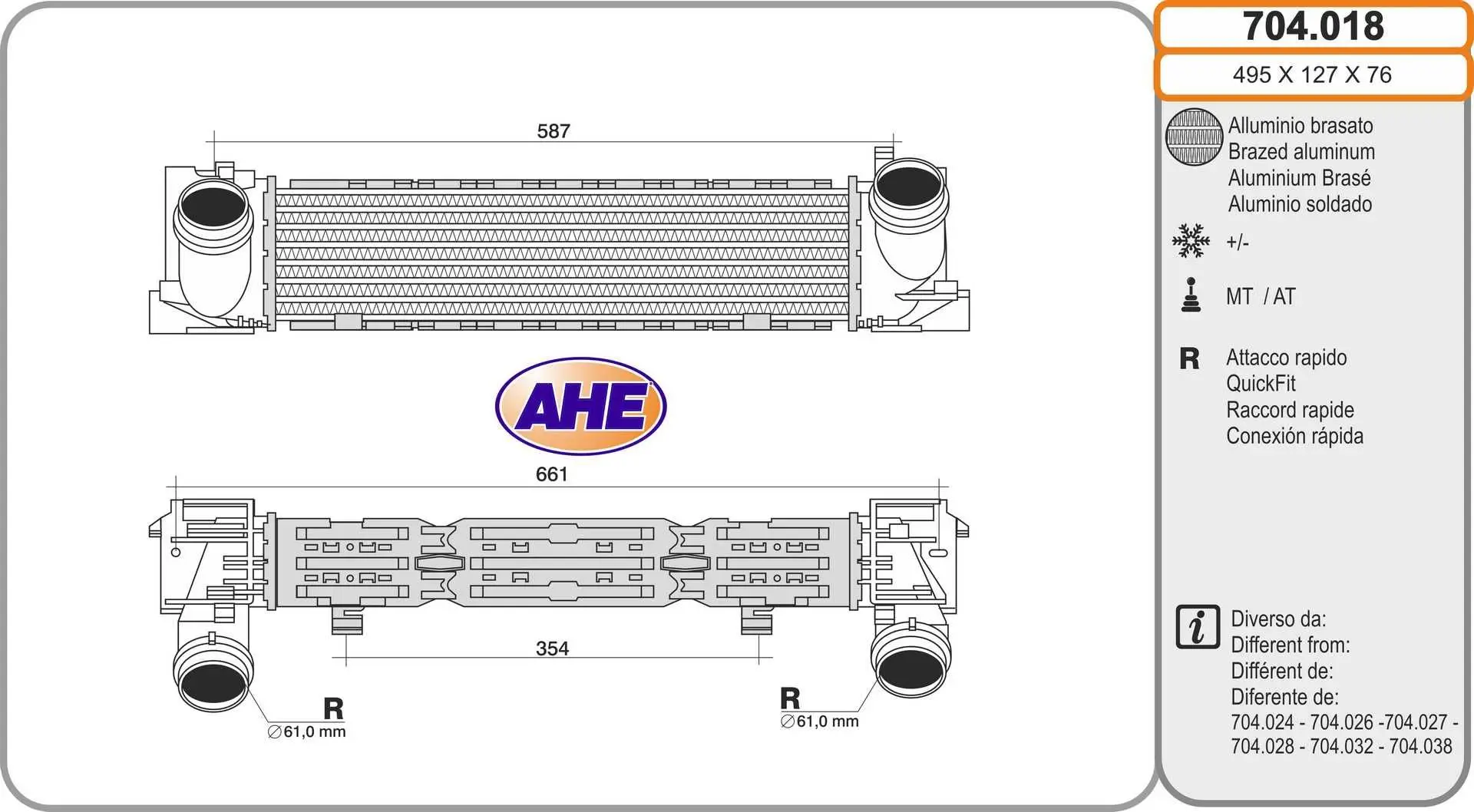 Intercooler, échangeur AHE 704.018 Critères Largeur de filet [mm] : 127 mm Longueur de filet [mm] : 495 mm Profondeur de filet [mm] : 76 mm