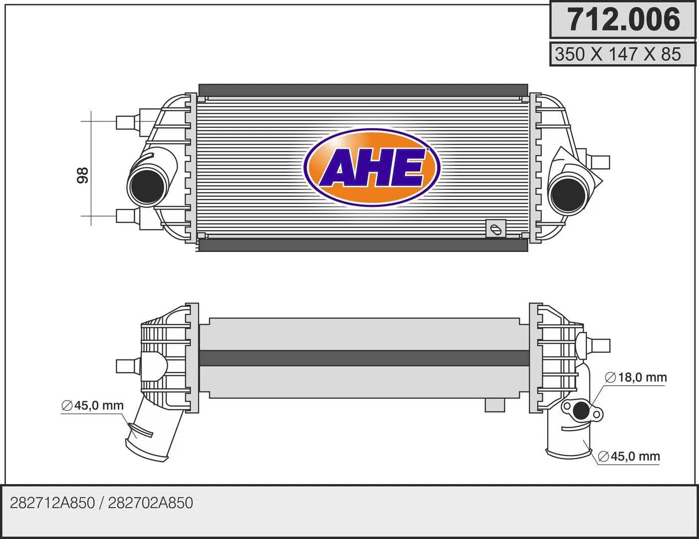 Intercooler, échangeur AHE 712.006 Critères Largeur de filet [mm] : 147 mm Longueur de filet [mm] : 350 mm Profondeur de filet [mm] : 85 mm