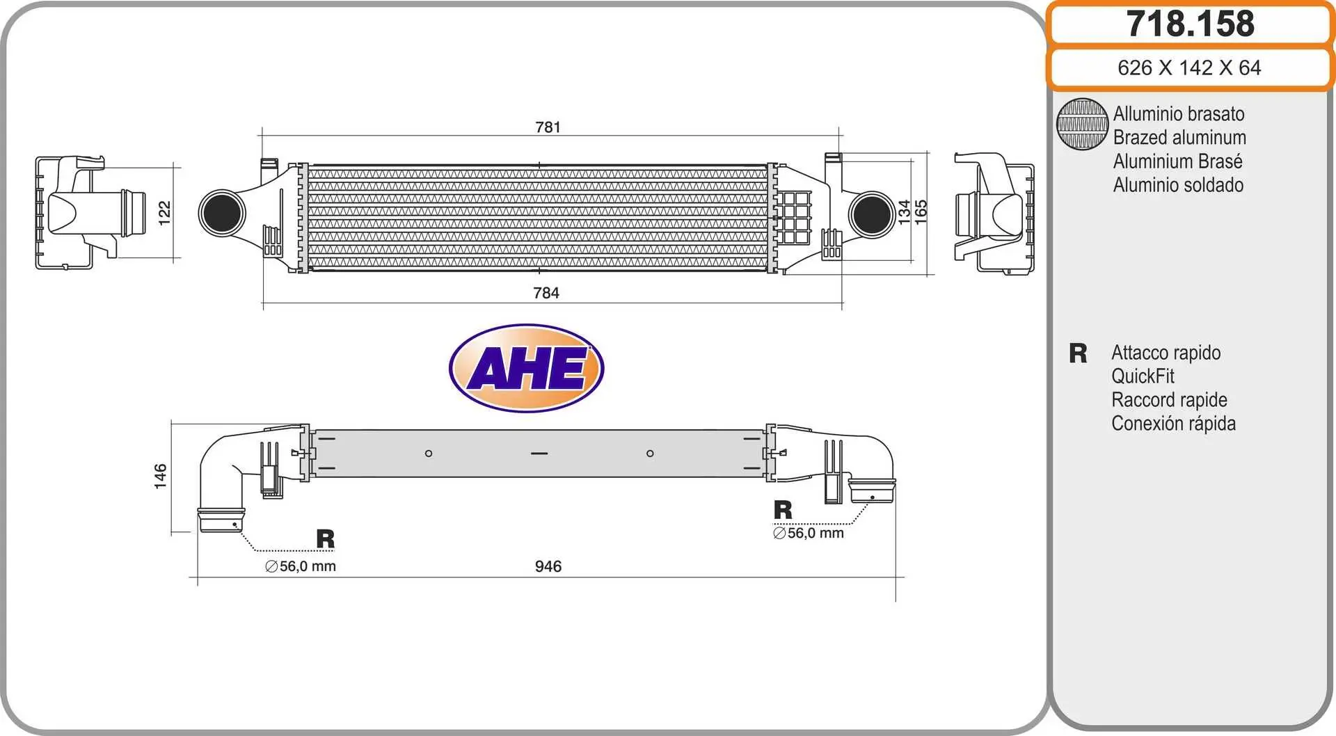 Intercooler, échangeur AHE 718.158 Critères Largeur de filet [mm] : 142 mm Longueur de filet [mm] : 626 mm Profondeur de filet [mm] : 64 mm