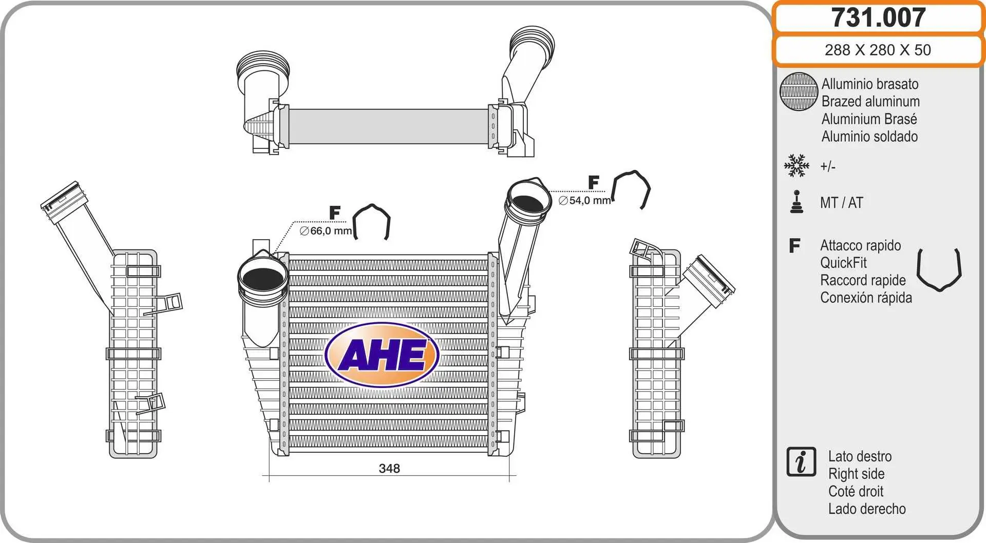 Intercooler, échangeur AHE 731.007 Critères Largeur de filet [mm] : 280 mm Longueur de filet [mm] : 288 mm Profondeur de filet [mm] : 50 mm