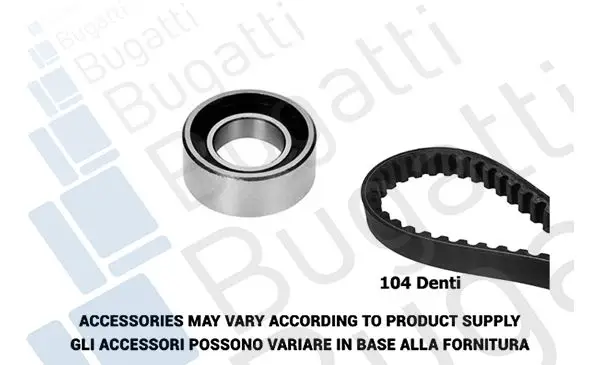 Kit de courroie crantée BUGATTI BKCD0711 Critères Diamètre extérieur [mm] : 57 mm Diamètre intérieur [mm] : 30 mm Hauteur [mm] : 24 mm Largeur 1 [mm] : 15 mm Nombre de dents 1 : 104