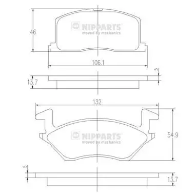 Kit de plaquettes de frein NIPPARTS J3602057 Pour véhicule avec Année jusqu'à 05.1996 Côté d'assemblage Essieu avant Critères Épaisseur [mm] : 13,7 mm Hauteur 2 [mm] : 106,1 mm Hauteur [mm] : 132 mm Largeur extérieur [mm] : 54,9 mm Largeur [mm] : 46 mm