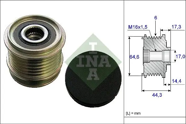 Poulie roue libre, alternateur INA 535 0130 10 Critères Article complémentaire / Info complémentaire 2 : Outillage spécialisé nécessaire pour le montage Diamètre 1/diamètre 2 [mm] : 64,6/17,0 mm Distance première gorge : 17,3 mm Largeur [mm] : 44,3 mm Nombre de gorges : 6