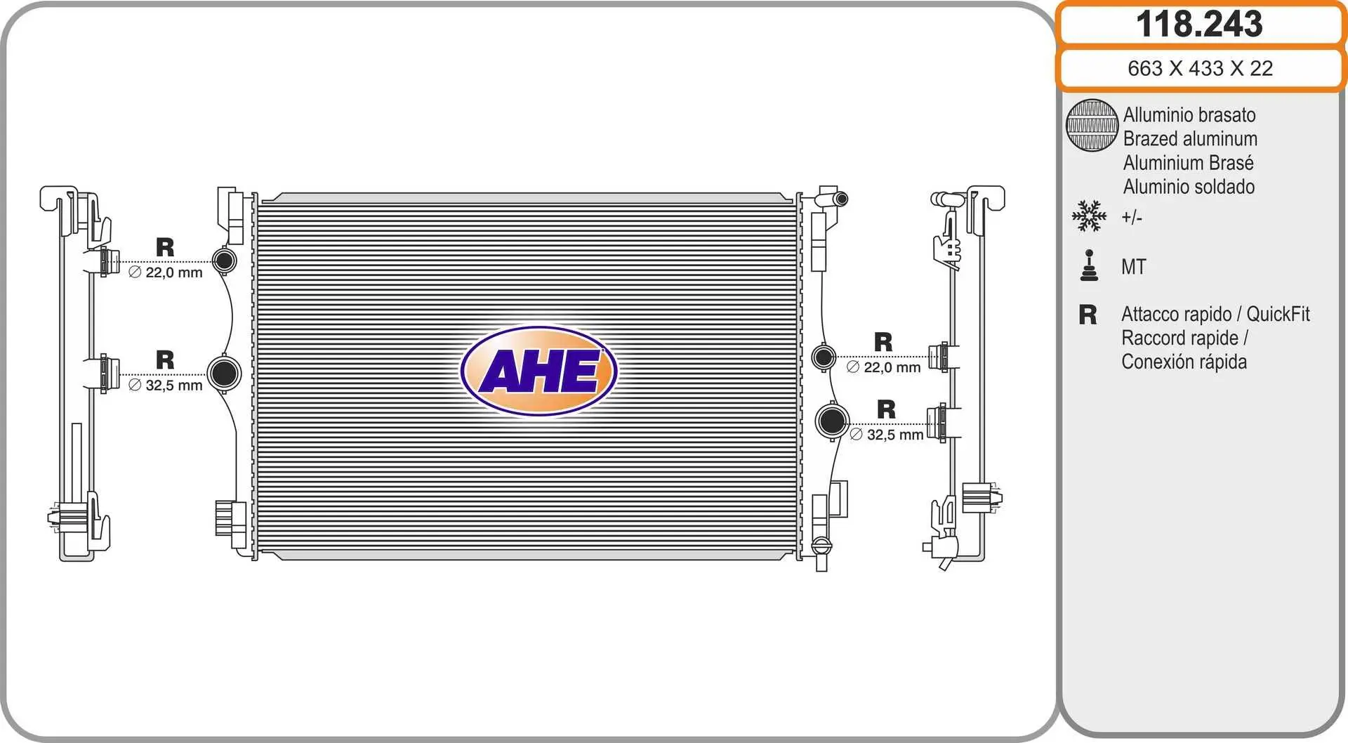 Radiateur, refroidissement du moteur AHE 118.243 Pour véhicule avec Boîte automatique à 7 vitesses Critères Largeur de filet [mm] : 433 mm Longueur de filet [mm] : 663 mm Profondeur de filet [mm] : 22 mm